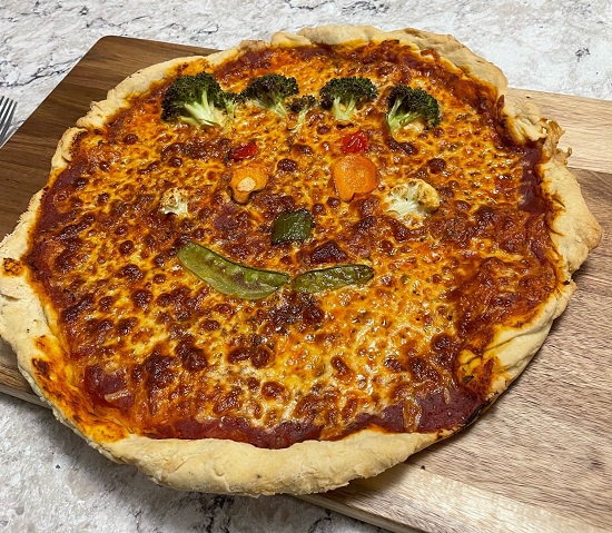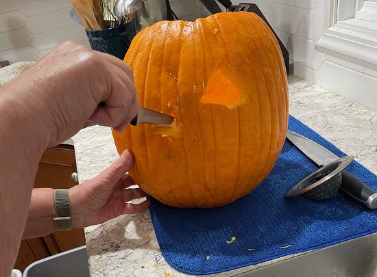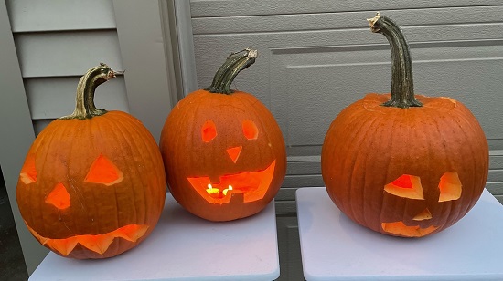 My parents joined me this year for Halloween at my house. We each carved a pumpkin (in the photo above from left to right to right – Mom, Kathy, Dad). Dad made pizza with a face for dinner.