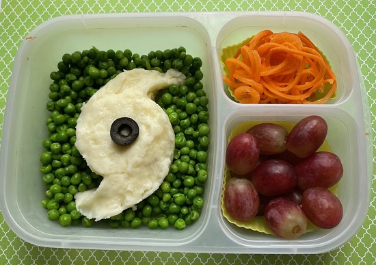 Left Side: Hurricane – Mashed potatoes with garlic and cheddar cut with a cookie cutter, black olive, green peas