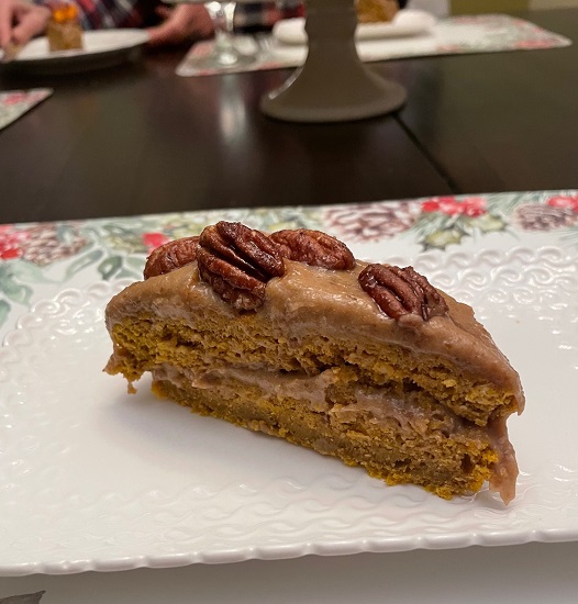 Vegan Honey Nut Winter Squash Cake with maple syrup and pumpkin pie spices topped with a cream made of cashew butter, maple syrup, dates, vanilla, and coconut milk. Decorated with the last flower from Deborah’s garden.
