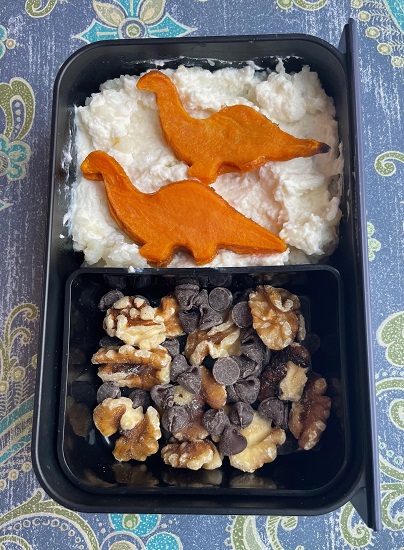 Contents: Dinosaurs – Sweet potato cut with a cookie cutter and roasted, mashed cauliflower with ricotta cheese, walnuts, chocolate chips