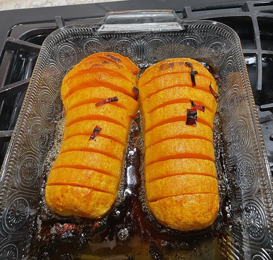 My friend Deborah’s birthday was this week. I invited her to come over yesterday for a neighborhood walk and dinner. Hasselback vegetables have been on my mind. It was exciting to try hasselback butternut squash. The whole meal was delicious.