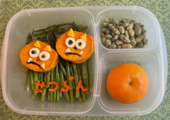 Left Side: Oni – Roasted sweet potato with cheese and food marker details, Setsubun (in Japanese) carrot cut with cookie cutters, roasted asparagus