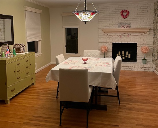 My dining room Valentine decorations are similar to last year but I added the peony topiaries from my summer decorations and kept the gingerbread houses from Christmas since they work for winter / Valentine’s day. My corner shelves reuse some items but are completely different from last year.