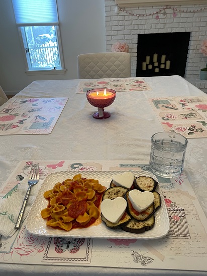 Meal: Hearts – Fresh Mozzarella cut with a cookie cutter, roasted eggplant, pasta, tomato sauce