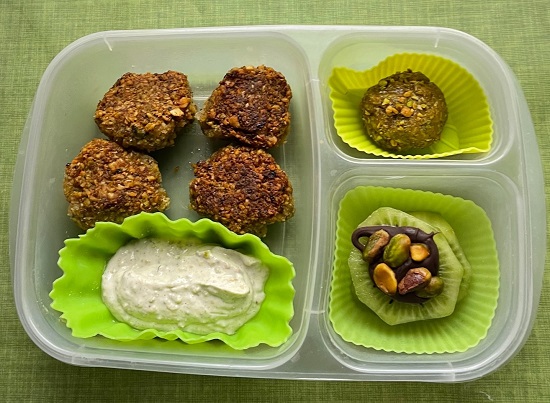Left Side: Pistachio Falafel with Yogurt Sauce (the sauce even has pistachio in it!)