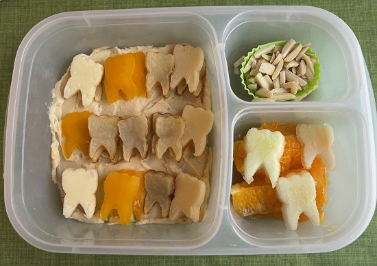 Left Side: Teeth – Cheddar cheese, bell pepper, potato (roasted) cut with a cookie cutter, hummus