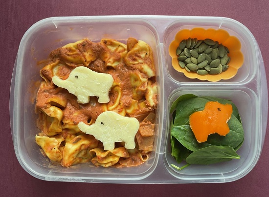Left Side: Elephants – Cheddar cheese cut with a cookie cutter, food coloring marker details, cheese tortellini with Vodka Sauce