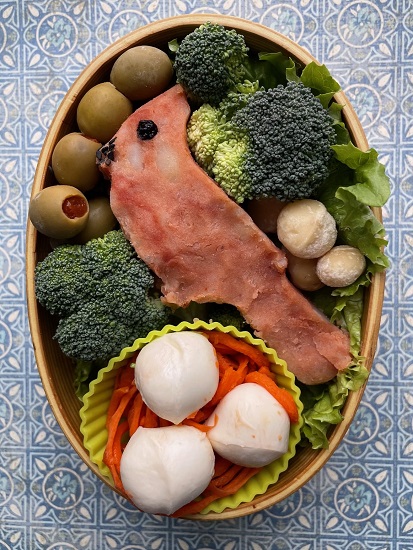 Contents: Cardinal – Mashed potato with tomato paste cut with a cookie cutter, Eye – Dried blueberry, Beak – Black sesame seeds, green pimento olives, broccoli, macadamia nuts, lettuce, Nest – Spiral carrots, Eggs – Mozzarella balls