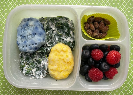 Left Side: Easter Eggs – Blue mashed potatoes with butterfly pea flower powder, Yellow mashed potatoes with turmeric, cut and imprint with Easter Egg imprint cookie cutter set, wilted spinach with ricotta cheese