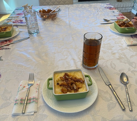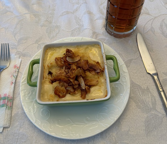When my parents visited, one night for dinner we had individual cauliflower gratin with coconut bacon. We like coconut bacon. I made and shared it once before. We enjoyed this meal.