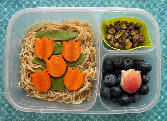 Left Side: Tulips – Carrot cut with a cookie cutter, snow peas, peanut noodles