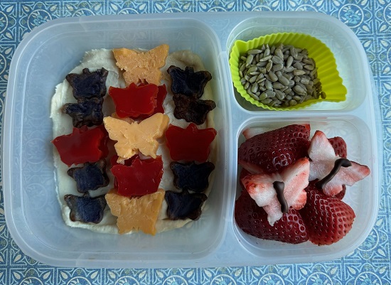Left Side: Butterflies – Red bell pepper, Cheddar, blue potato cut with a cookie cutter then roasted, hummus