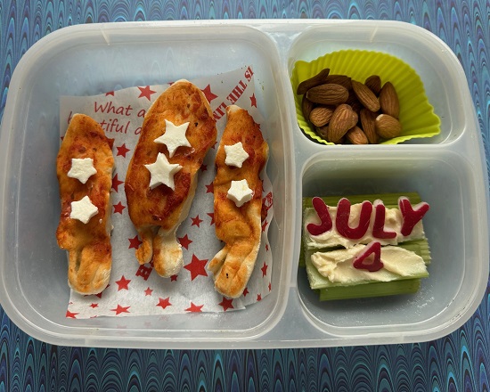 Bottom Right: July 4 – Radish cut with cookie cutters, hummus, celery