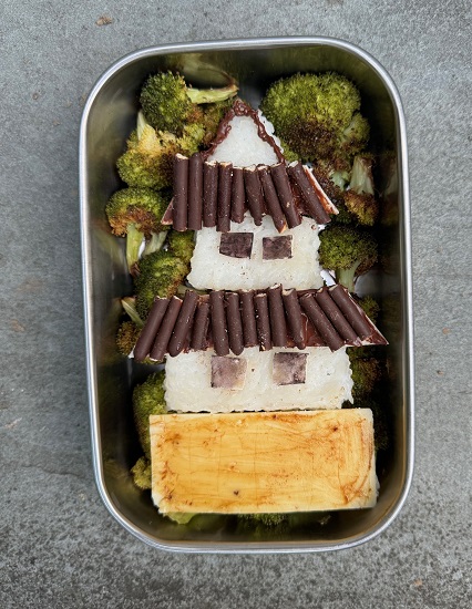 Castle: Rice, Roof: tortilla with melted chocolate and Pokey, Windows: tortilla with food coloring, Rock wall under castle: cheese painted with espresso and water, Background: roasted broccoli