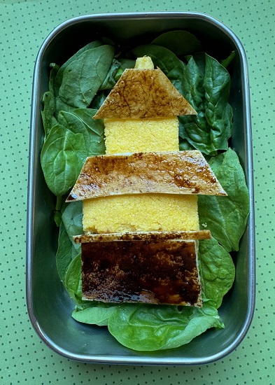 Pavilion: polenta, Bottom of Pavilion: cheddar brushed with espresso powder and water, Roof Pieces: tortilla brushed with espresso powder and water, Background: spinach