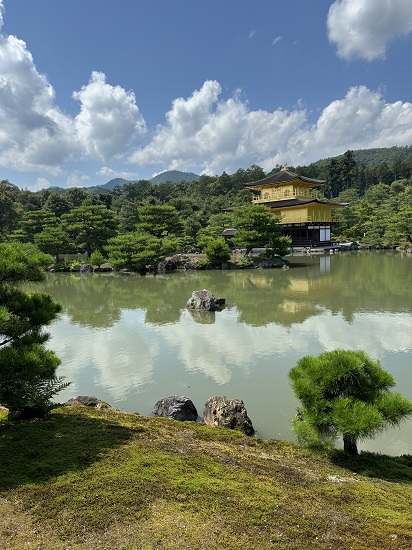 Here is my rudimentary food version of Kinkakuji (Golden Pavilion). The vision in my mind was much better than it is in reality. I had trouble with the shapes, especially the roof shapes. I had other things going on at the time of making this (my central air conditioning unit died and I was dealing with quotes for replacement – big $$) so I did not spend a lot of time with this creation. Hopefully you can tell what it is supposed to be before seeing the inspiration photo below.