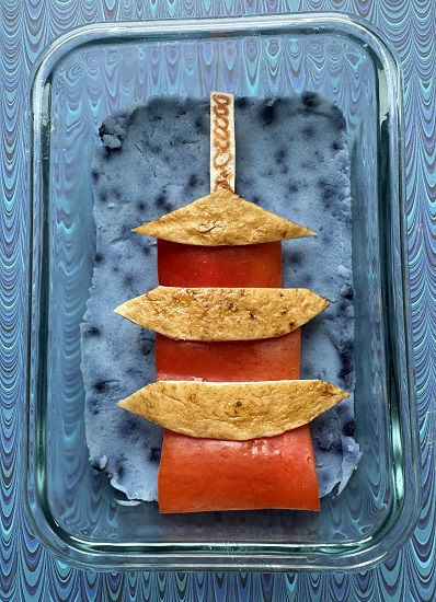 Pagoda – red bell pepper, Roof pieces – tortilla brushed with espresso and water, Sorin – tortilla with circles drawn with food coloring marker, Night Sky – mashed potatoes with butterfly pea powder