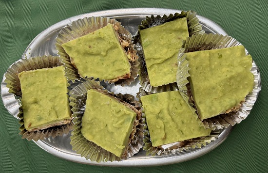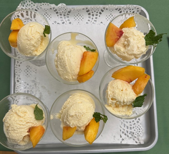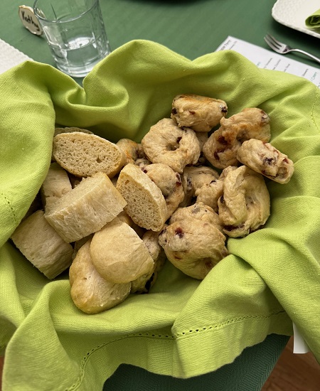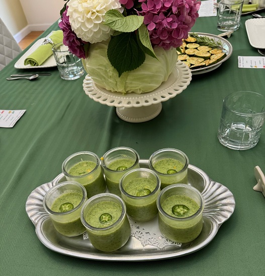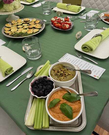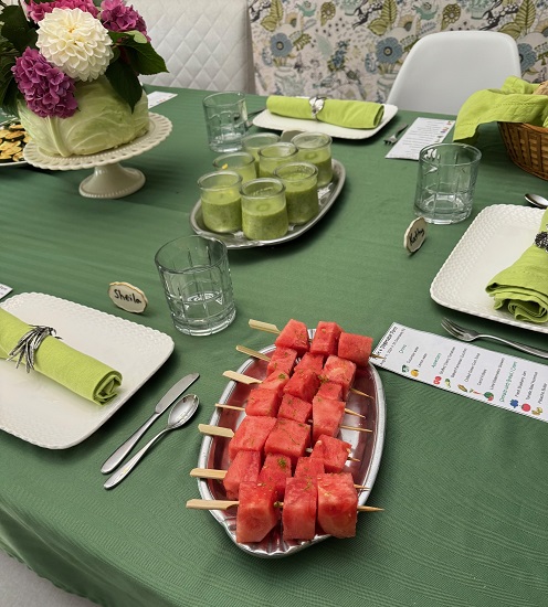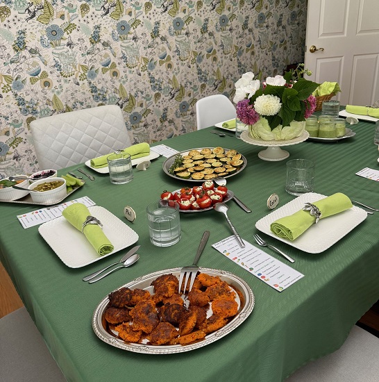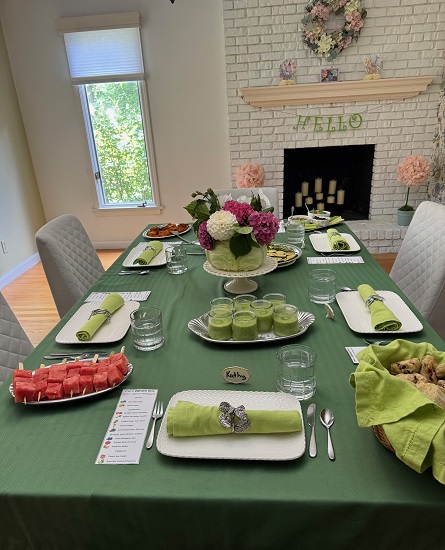 I put more effort into garnish than usual and my guests noticed! The pistachio butter was easy to make but was a surprise hit. I tried many new recipes for the first time including adding dried cherries to my normal bagels. I loved the baked zucchini. The only thing I would not make again is the carrot fritters. They had a nice flavor but I wanted them to be crispy and didn’t enjoy making them. As usual for a party with frozen desserts, we scooped and portioned ahead of time and put back in the freezer. It made it easy to serve the dessert course. I think that all in attendance enjoyed this unusual themed party!