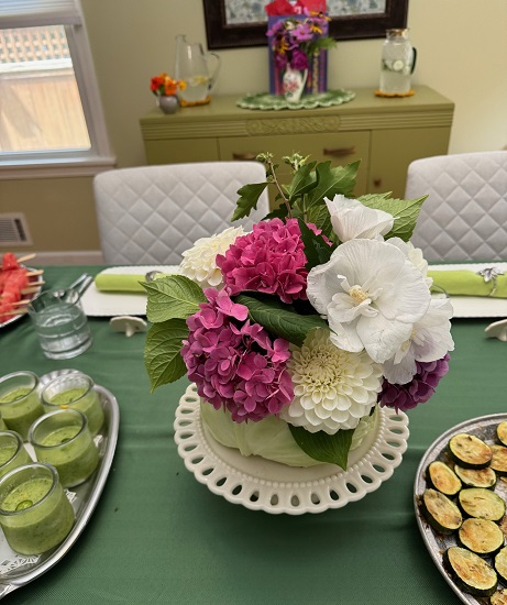 - Vase & Flowers – Cabbage carved with a glass inside to hold the flowers, Hydrangeas, Rose a Sharon, Dalias (all but the Dalias were from my garden – they were from a farmers market).