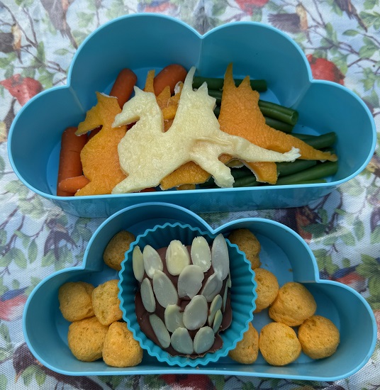 Large Box: Dragons – Four tortilla with broiled orange and white cheddar, cut with a cookie cutter, carrots, green beans