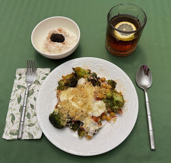 I made this meal for myself, it was delicious and I expect it will become part of my usual meal rotation. I even garnished the side and drink! Garnish elevates a meal. I don’t often take the time to plan / do it but I am happy with the results when I garnish.