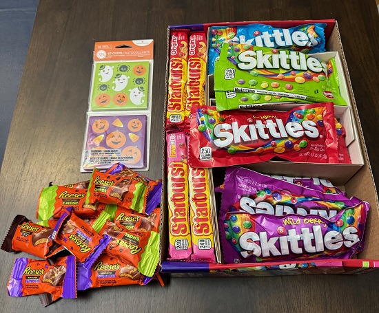 It was hot this year. 74 degrees! My first trick-or-treater arrived around 6:10 pm and by 7:40 pm I was out of treats. I prepared 30 bags plus the one wrapped book for my 3 year old neighbor. See photos below for what I put in the bag – assorted full size candy, a sticker sheet, and small chocolate. The children and parents were all very polite and thankful. Only one kid asked if they could have more than one bag, and their parent quickly said no. I like giving out bags since the kids are delighted and it eliminates the rare child trying to grab multiple pieces.