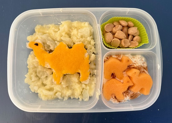 Bottom Right: Camels – Cantaloupe cut with a cookie cutter, Eyes – cinnamon attached with a toothpick, Ricotta cheese with cinnamon