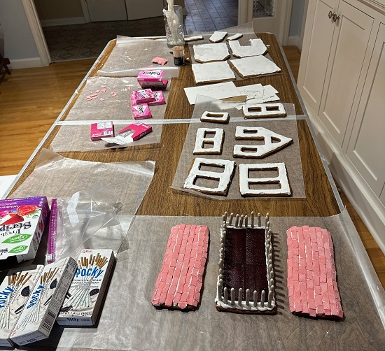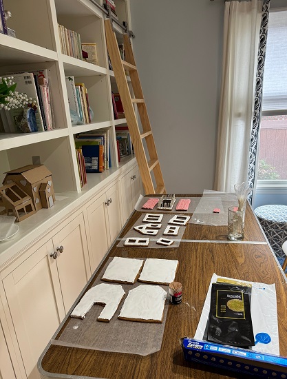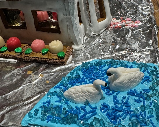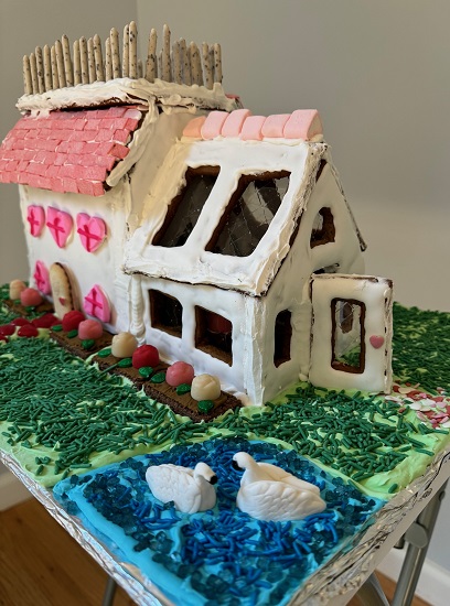 This year was my 6th year (non-consecutive) to make gingerbread for Sweet Creations at the Eastman Museum. In my continuing quest to try different things, I have a greenhouse attached to the house with a widow’s walk. It is my first time making green grass in gingerbread (my niece did it a few years ago).