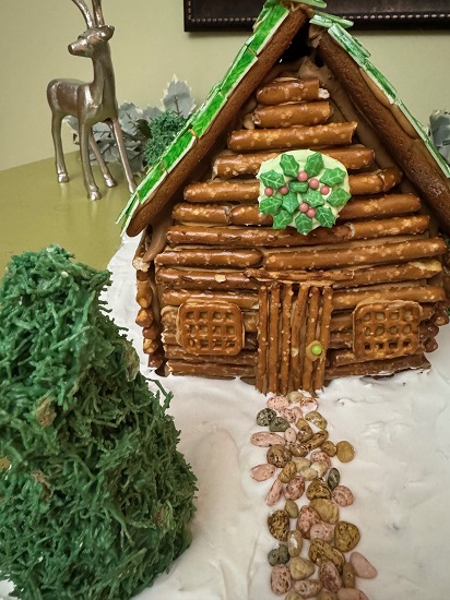 This year I checked another theme off my Gingerbread House to-do list! I made a pretzel log cabin. Rustic is not my normal design aesthetic (perhaps that is why I did not do a log or thatched roof). I am delighted with this beautiful house!