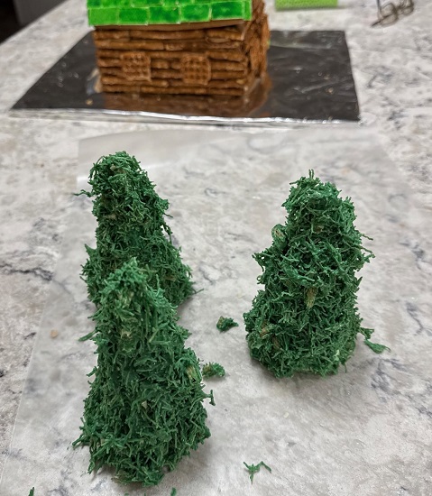 Trees: Sugar Ice Cream Cones covered with Shredded Wheat mixed with Green Candy Melts (see note at end)