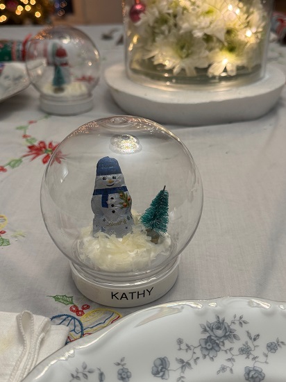 Snow Globe Favor: I came up with the concept. When I went to the Dollar Tree to look for something to use, I found snow globe kits! I also found mini trees at the Dollar Tree. I used my labeler to add names. I made Royal Icing and assembled with a Lindt Chocolate Snowman, mini tree, and shredded coconut. The Royal Icing did not get a hard as usual (maybe since I put the globe on before drying). It made it easy for people to remove and eat their chocolate after the meal. Afterwards, I was able to easily wash off the icing and can use in the future with something else.