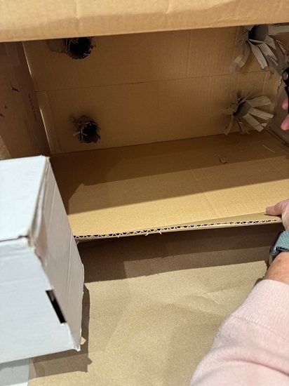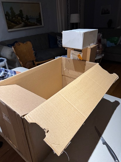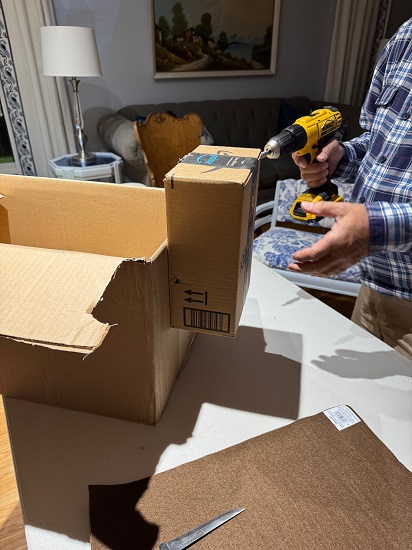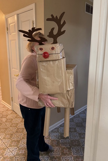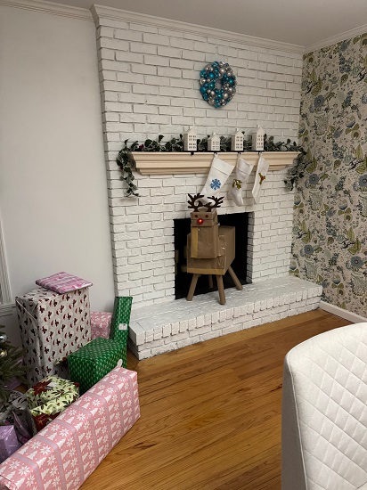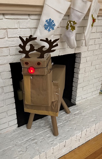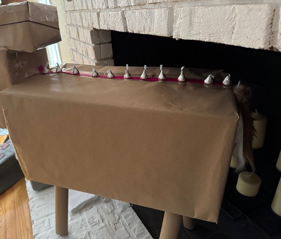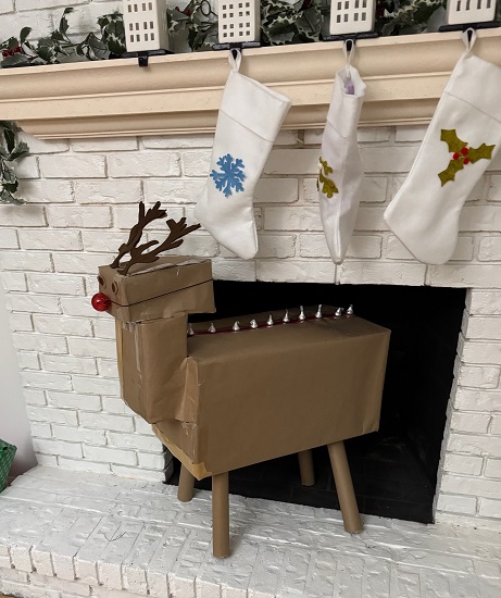 Last year for some of my niece’s gifts I made a snowman stack. This year I decided to make a reindeer present stack. My Mom and I collaborated and my Mom, Dad, and I assembled. You can see in the photos below our method. My Dad used a drill to attach the neck and head to the body. I made the antlers by hot gluing felt onto cardboard. I made the eyes out of cardboard. I used a flashing nose from the Dollar Tree. We used brown and white fake fur for the tail. We wrapped the boxes in brown paper. The legs are wrapping paper rolls that we cut and hot glued to the body box. I hot glued ribbon and Hershey kisses for the harness. We added wrapped presents in each section of the body. I love how my mom styled it to look like it came down the chimney. It was a lot of fun for all of us!