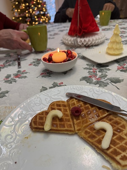 Waffles with candy cane shaped apple cut-outs, raspberries, maple syrup, and Tree Shaped Butter