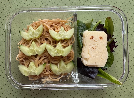 Left Side: Bamboo – Cucumber cut with a cookie cutter, peanut noodles