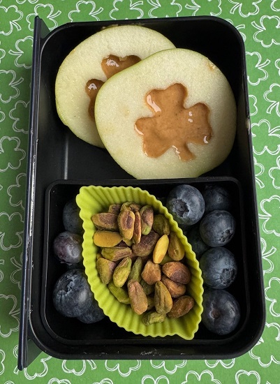 Contents: Shamrock Apple and Peanut Butter sandwich (cut two slices of a green apple for each sandwich, spread peanut butter on bottom layer, cut shamrock shape into top slice of apple with a cookie cutter, gently press the two layers together), pistachios, blueberries