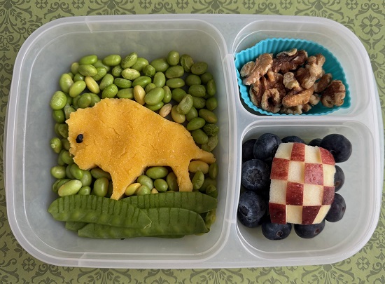 Left Side: Buffalo – Polenta cut with a cookie cutter, Eye – Dried blueberry, snow peas cut to look like grass, soybeans