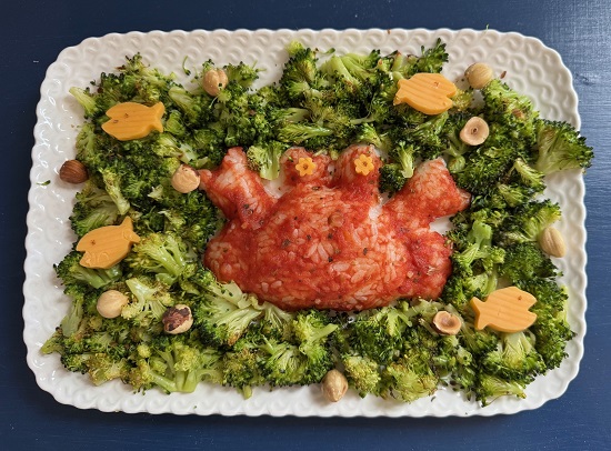 Crab – Niishiki rice shaped in a mold, tomato sauce on top, Eyes – Cheese cut with mini cutter, cinnamon