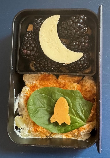 Contents: Moon – Cheddar cut with a cookie cutter, blackberries, Marcona almonds, Rocket – Cheddar cut with a cookie cutter, spinach leaf, cottage cheese potato salad