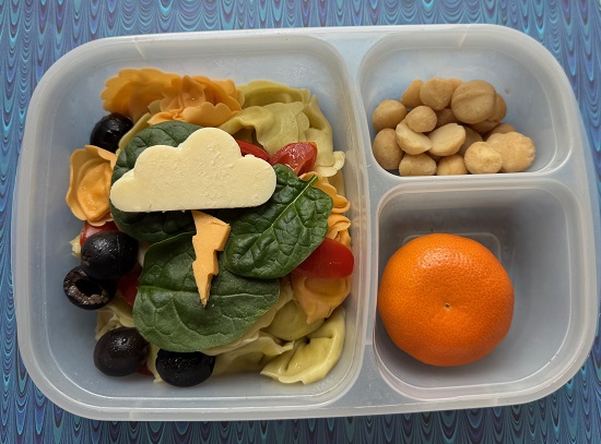 Left Side: Cloud with Lightning – Cheddar cheese cut with a cookie cutter, tortellini with olive oil, red wine vinegar, black pepper, black olives, grape tomatoes and fresh spinach