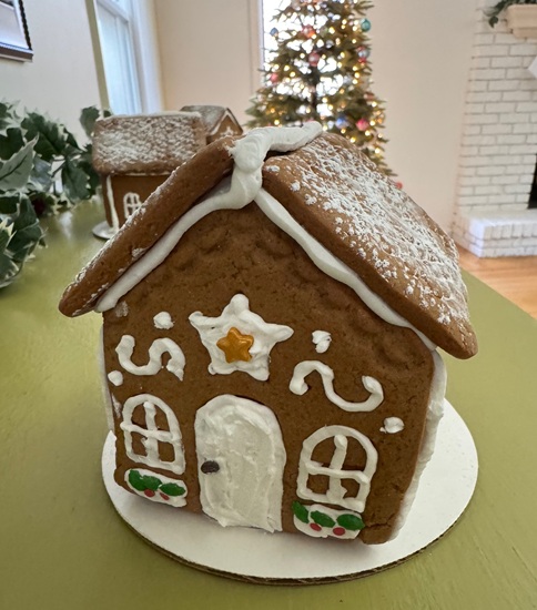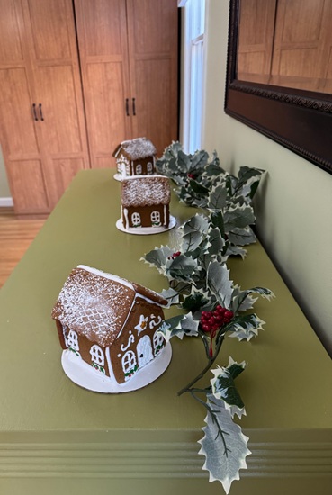 I like to have a gingerbread house on my dining room buffet as holiday / winter decoration. This year I used an easy cookie cutter set from King Arthur Baking Company to make 3 mini houses. They made a whimsical table decoration for a dinner party and are now decorating my dining room.