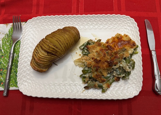 Mom and I prepared a delicious dinner for the family, featuring perfectly cooked Hasselback potatoes with crispy slices and a side of green bean gratin. This satisfying combination made for a delightful meal enjoyed by Mom, Dad, and myself.