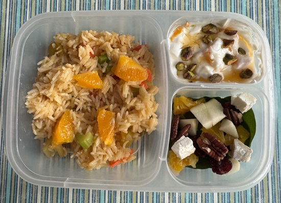 Continuing my Featured Ingredient meal series, today’s spotlight is on orange. As with the rest of the series, this meal was packed into an Easy Lunch Box, though for dinner I served the rice and salad on plates for my parents and myself (not pictured). This dish turned out to be a delightful surprise hit—we couldn’t stop talking about it afterward, especially the fragrant rice and the bright, citrusy salad dressing.