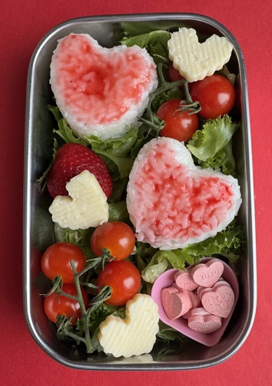 Contents: Heart Rice – Used a rice mold to shape hot cooked Nishiki rice, strawberry juice on top (from a frozen strawberry thawed in a microwave for a few seconds) Hearts – Cheddar cheese cut with a cookie cutter, cherry tomatoes, Starbursts Conversation Hearts, Romaine lettuce