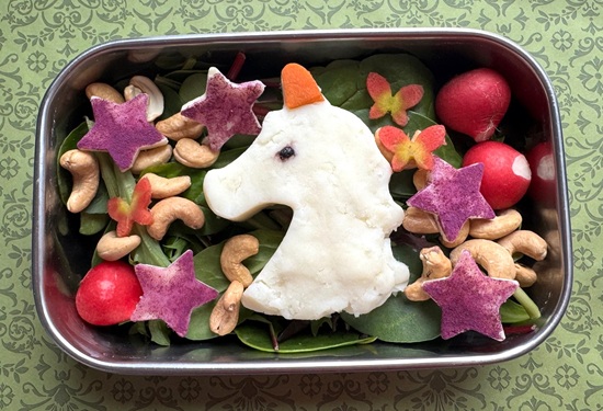 Contents: Unicorn – Cheddar cheese mashed potatoes slightly cooled, then cut with a cookie cutter, Eye – Dried blueberry, Horn – Carrot, Stars – Cheddar cut with a cookie cutter, then dipped in purple sweet potato powder, Butterflies – Rainbow carrot cut with a cookie cutter, Radish, cashews, spring salad mix
