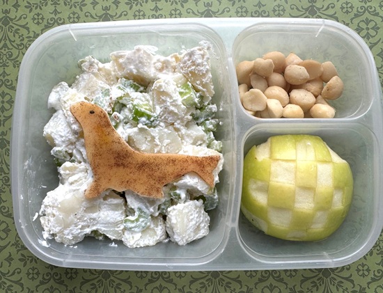 Left Side: Seal – Mozzarella cheese slice cut with a cookie cutter then rubbed with cinnamon, Eye – food coloring marker, cottage cheese potato salad