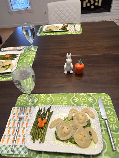 Bunny Ravioli – I used my favorite pasta dough, filling – Ricotta, Asiago, Parmesan, salt and pepper, (I put in the refrigerator on parchment for a few hours), just before serving – in a frying pan gently boil in water for about 5 minutes, added face details with a toothpick and cinnamon before serving