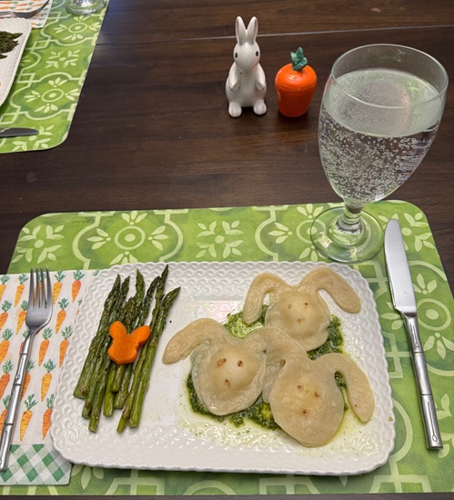 Bunny Ravioli – I used my favorite pasta dough, filling – Ricotta, Asiago, Parmesan, salt and pepper, (I put in the refrigerator on parchment for a few hours), just before serving – in a frying pan gently boil in water for about 5 minutes, added face details with a toothpick and cinnamon before serving