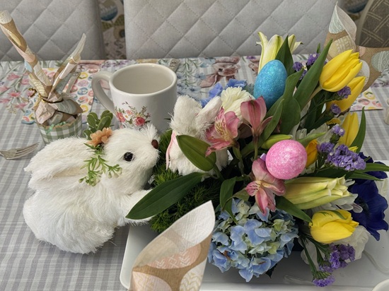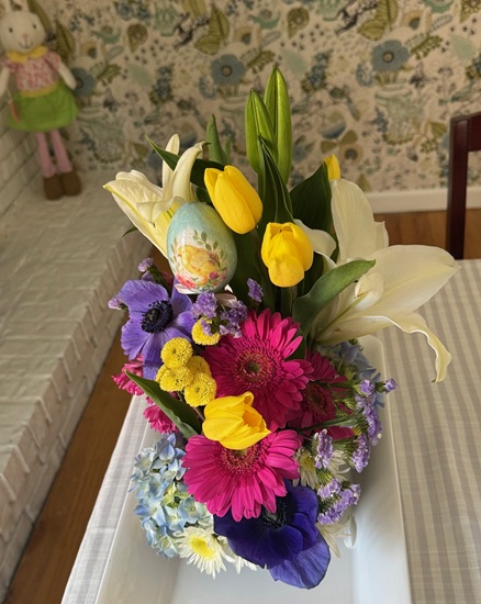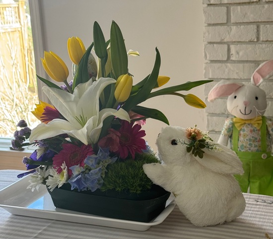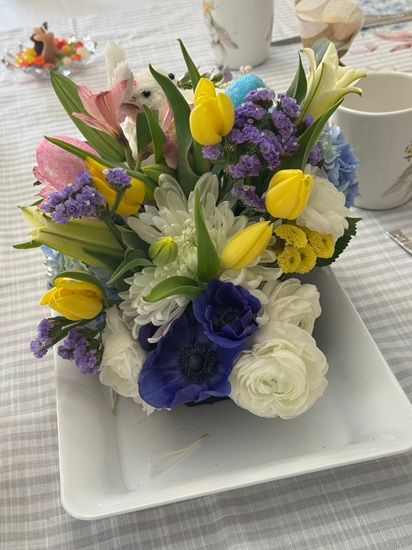 As always, I loved putting together a beautiful table. My mom added her special touch with gorgeous floral arrangements, and she even created the sweetest pansy bunny display for my porch—it was such a charming detail and perfect for the season. All in all, it was a joyful gathering filled with good food, lovely company, and meaningful tradition. I think everyone had a great time!