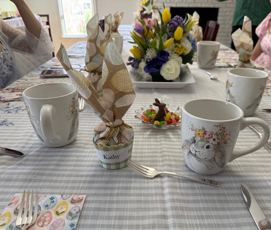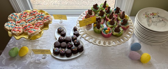 - Place Cards / Favor – Assorted Lindt Chocolate Eggs, mini bunnies, Rolos folded in paper napkins to look like Bunny Ears, put in cups with green Easter grass
