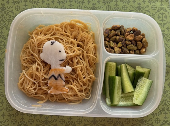 Left Side: Charlie Brown – Daikon radish cut with a cookie cutter, food coloring marker, Peanut Noodles